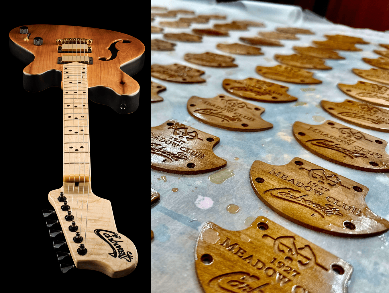 Hours were spent fabricating the wood and finishing the madrone to its final shape. The madrone that stood for a century at Dr. Mackenzie’s first golf course in North America will live in perpetuity in the sole plates of Small Batch Meadow Club Carbonetti and in the guitar handcrafted by Jimmy.